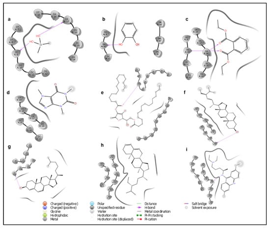 2D ligand interaction diagram of dimethyl silanediol (a), catechol (b), diethyl phthalate (c), caffeine (d), l-(+)-ascorbic acid 2,6-dihexadecanoate (e), stigmasterol (f), cholesta-4,6-dien-3beta-ol (g), stigmastan-3,5-diene (h), and quinacrine (i) with B-DNA.