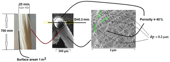 Polypropylene hollow fiber membranes at a length of 700 mm and a diameter of 0.3 mm are assembled so as to achieve a filtering surface of 1 m2 [52,54]. The fibers have a porosity of 40% [54,55] and a pore diameter of less than 0.2 µm [56] (Figure 2). This type of module with polypropylene hollow fiber membranes allows operation over the entire pH range, in oxidizing or reducing solutions at temperatures up to 100 °C without dimensional changes and can be sterilized by known physical-chemical methods [57,58,59].