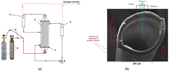 (a) The schematic presentation of the 10-undecylenic acid oxidation or p-nitrophenol reduction installation: 1: membrane contactor; 2: polypropylene hollow fiber membranes; 3, 4: hydrogen or oxygen source; 5: gas-liquid separator; 6: pump for solution in tert-butyl alcohol (methanol, ethanol, or propanol); and (b) fluid circulation through the system.