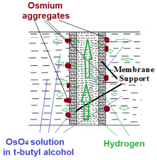 Composite membranes based on metal nanoparticles fit in a very special way in all these directions of development of membrane processes. However, the reactivity or catalytic activity are among the best studied and used characteristics of metal nanoparticle–polymer based composite membranes [27,28,29,30,31]. Although they have special properties, osmium and its compounds have been used relatively little in membrane processes [32,33], the main application being the metallization of polymeric or biological membranes for studies in electron microscopy [34].