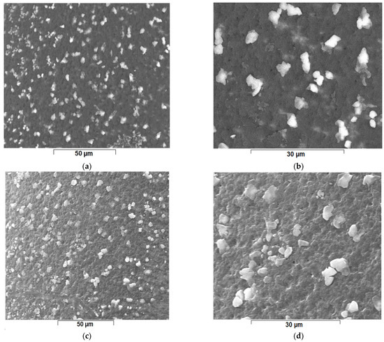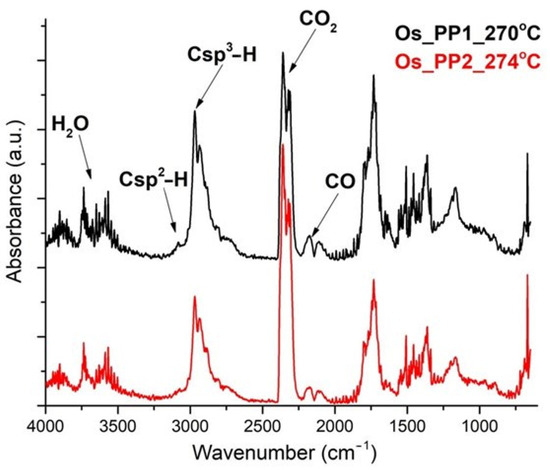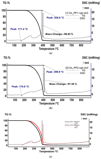 The concentration of the solution of osmium tetroxide in tert-butyl alcohol was chosen at 0.6 g/L for the Os-PP1 membrane and 0.8 g/L for the Os-PP2 membrane. The concentrations of the solutions were chosen in order to be able to compare these composite membranes with the previously obtained and reported membrane, Os-PP0 [64]. The concentration of the solution of osmium tetroxide in tert-butyl alcohol was 0.4 g/L. The increase in concentration of osmium tetroxide had in view obtaining a high concentration of osmium atoms at the surface of the raw membranes (Figure 7) highlighted by energy dispersive spectroscopy analysis (EDAX) (Table 1).