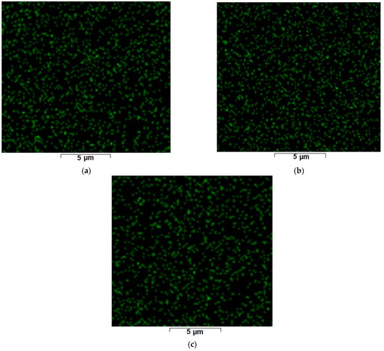The distribution of osmium on the surface of the target membrane was performed both before and after the redox processes (Figure 9a–c; see also Figure S6). The relatively uniform distribution on the membrane surface and the size of the nanoparticles were both remarkable. This uniform distribution of osmium nanoparticles on the processed membranes was due to the microfiltration process which, in addition to the disintegration effect, directed the nanoparticles on the surface and towards the interior of the pores, so that the map of nanoparticles reflected the pore distribution of the support membrane. The surface of 1 m2 represents a disadvantage for the study of nanoparticles, regardless of the analysis technique, due to dispersion (approx. 1.0–1.6 g/m2).