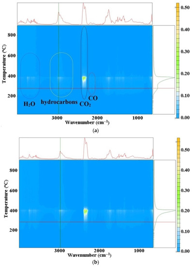 Thermal analysis (TG, DSC) was performed with a STA 449C Jupiter apparatus, from Netzsch (NETZSCH-Gerätebau GmbH, Selb, Germany). Each sample weighed approximately 10 mg. The samples were placed in an open alumina crucible and heated up to 900 °C with 10 K∙min−1 rate, under flow of 50 mL∙min−1 dried air. As reference, we used an empty alumina crucible. The evolved gases were analyzed with a FTIR Tensor 27 from Bruker (Bruker Co., Ettlingen, Germany), equipped with a thermostat gas cell.