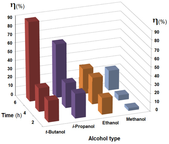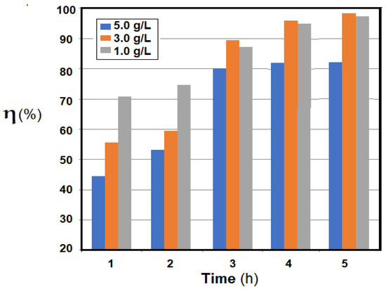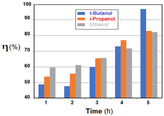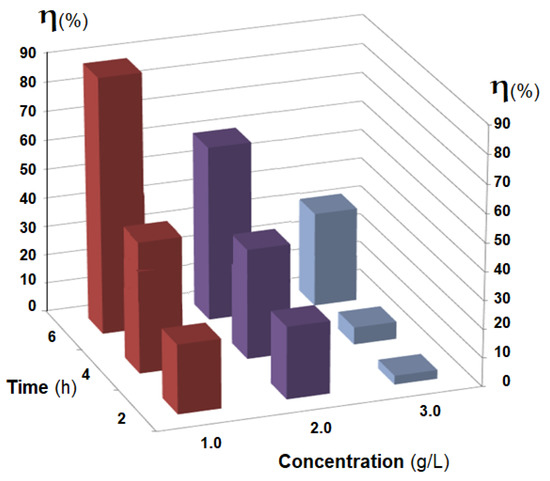The conversion (η %) of analytes calculated using the solution’s concentration (2) or absorbance (3) [64,65] were: