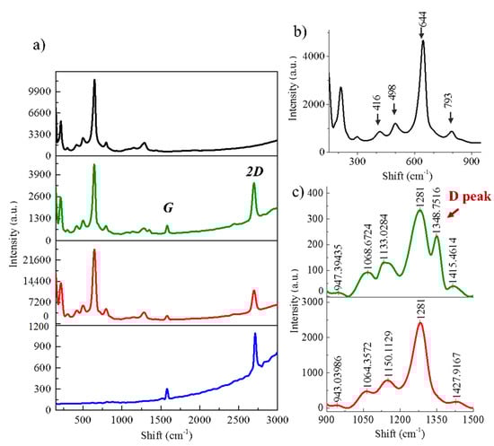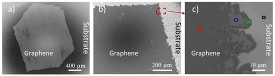 The absence of the D peak away from the edge of graphene as well as the presence of G and 2D peaks in areas pointed by the red and blue circles with an intensity ratio I2D/IG > 2 indicates that the graphene crystal is monolayer, homogeneous and of high quality. In Figure 2b, peaks below 900 cm−1 are attributed to Cu oxides (CuO and Cu2O) [28,29]. These Cu oxide peaks appear in the red and green spectra in Figure 2a and are absent in the blue area. These oxides are therefore the source of the contrast observed in the different areas of the graphene monolayer. The contrast is observed over the entire surface covered by graphene showing that the oxidation under graphene is not homogeneous. We can thus consider that the graphene crystal lays on two different substrates, Cu and Cu oxides.