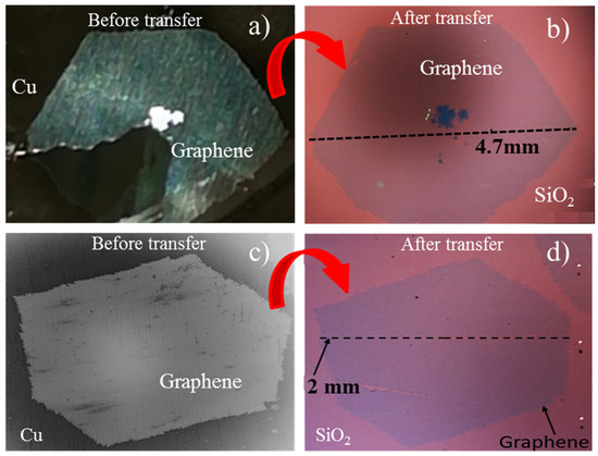The extraordinary properties of graphene has garnered much attention, and has motivated researchers to investigate its technological applications due to its high electrical and thermal conductivities, flexibility and stability [1,2,3,4,5,6,7]. Chemical vapor deposition (CVD) on Cu has been broadly used to synthesize large-area and high-quality graphene [8,9,10,11]. Recently, the synthesis of large-area monocrystalline graphene has been of great interest due to the lack of grain boundaries which are responsible for graphene performance degradation. Because the majority of applications require the as-grown graphene to be transferred to a host substrate, it is important to study how large monocrystalline domains behave during this process. Indeed, the transfer of graphene can have a considerable impact on its physical and electrical properties [12,13,14,15,16,17,18]. Transfer steps may damage the graphene film, causing cracks, wrinkles and polymer residues and thus, reducing the carrier mobility of graphene, a parameter of the upmost importance for electronic applications [19]. Several methods have been developed to transfer the graphene from metal to the host substrates. The most common transfer technique involves the wet etching of the metal layer used as a catalyst template for the graphene growth, typically Cu for monolayer graphene. This technique is reliable and well-studied [9,20,21], but has the disadvantage of a slow etching process. Furthermore, destroying the Cu film is not environmentally friendly. To overcome these limitations, remarkable progress has been made in the development of transfer techniques that avoid the etching of growth substrate. The most used method is the so-called electrochemical delamination transfer technique [16,22,23,24,25,26,27]. Using this technique, minutes are sufficient to separate the graphene layer from the growth substrate, compared to many hours required by the wet etching transfer method. Furthermore, this transfer technique significantly reduces metal consumption and the associated environmental pollution, and allows for the reuse of the metal substrate, [16,22] which is especially promising for large-scale, low-cost production.