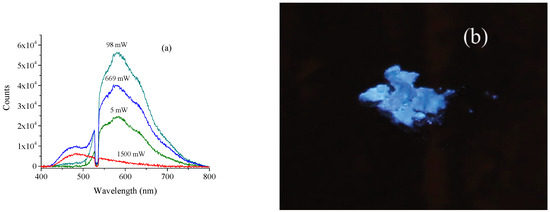 The spectra of the fluorescence for s-C3N4 powders as function of laser power are shown in Figure 1a. The increase in laser intensity leads to a gradual decrease in Stokes intensity of the fluorescence of the s-C3N4 and an increase in the intensity of the anti-Stokes fluorescence. The maximum of the anti-Stokes fluorescence in s-C3N4 nanoparticles was observed at 480 nm. The anti-Stokes component had a minimum threshold of ~100 mW for this experimental setup. The Stokes (regular) component increases up to laser intensity 98 mW and then starts decreasing. The ratio of the intensity of the anti-Stokes peak (centered at 480 nm) to that of the Stokes peak (centered at 582 nm) was measured to be I484/582 = 6.4 × 10−3 at a low level of intensity (5 mW) of a green pulsed laser, whereas it rises to I484/582 = 2.27 with a high level of laser intensity (1500 mW). The powder is bright blue, which indicates that the intensity of the fluorescence has moved to the lower wavelength region under high power illumination.