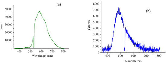 Spectra of the fluorescence of the spherical modifications by (a) green laser (514 nm) and (b) ultraviolet laser (266 nm).