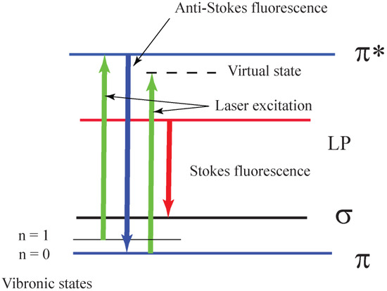 This diagram can be considered as a combination of the simplified energy level diagram described in Ref. [22] and that discussed in Ref. [10]. When the laser intensity is low, we observe stock fluorescence excited by a green laser with a peak centered at 582 nm. Increased temperature in the s-C3N4 nanoparticles with increasing laser intensity leads to the growth of the electrons in the first vibronic state (n = 1 in Figure 5) and, therefore, to an increase in anti-Stokes green luminescence [10]. Our hypothesis is in agreement with a recent finding that low-dimensional two-dimensional perovskite (C6H5C2H4NH3)2PbCl4 quantum wells are efficient in spontaneous anti-Stokes visual luminescence under visual or near-infrared laser excitation [26]. They demonstrate a luminescence upconversion process from the visible self-trapped exciton to an ultraviolet free exciton excited by the nanosecond pulse laser excitation.