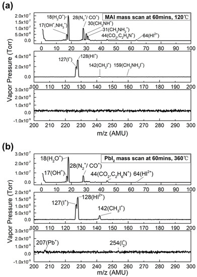In Figure 1, the mass scans are presented from 0 to 300 AMU for (a) MAI boat temperature of 120 °C and (b) PbI2 boat temperature of 360 °C. Figure 1a shows that water and water fragment (AMU 17) (with pressures of 2.02 × 10−7 and 5.10 × 10−8 Torr, respectively) were the dominant peaks in the spectrum. The other noticeable peaks are the MAI-dissociated products CO, CH3NH2, CH3NH, HI, and I. No MAI peak (AMU 159) was detected by RGA. In Figure 1b, the pressures of water and OH+ are both higher than that of MAI evaporation because of the higher evaporation temperature of PbI2. Additionally, the pressures of all MAI-dissociated products, except for CH3I, were greatly reduced. This suggests that even without MAI evaporation, MAI-dissociated products existed in the chamber. For both evaporations, Pb+ and I2+ were not detected by RGA. Table 1 shows the most noticeable peaks along with the most likely compounds that they are associated with. During the MAI evaporation, the main MAI peak was not detected by RGA, but the peaks of the MAI-dissociated products CO, CH3NH2, CH3NH, HI, and I were noticeable. This indicates that MAI did not evaporate as a whole molecule; instead, it thermally decomposed into its components in the vacuum during the evaporation. These results agree well with the observations of Bækbo, et al. [17]. For PbI2 evaporation, Pb (AMU 207) and I2 (AMU 254) peaks were not detected (as seen in Figure 1b), which suggests that PbI2 evaporates without dissociation. I, HI, and CH3I were the residual compounds from MAI evaporation.