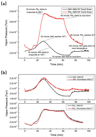 (a) Comparison of water (AMU 18) trend scans in MAI and PbI2 evaporation. (b) Comparison of water (AMU 18) and normalized AMU 17 trend scans in MAI and PbI2 evaporation.