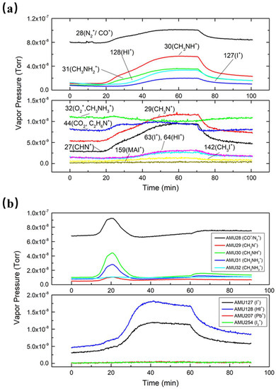 (a) Trend scans for MAI-dissociated products evaporated at 120 °C. (b) Trend scans for MAI− and PbI2-dissociated products in PbI2 evaporation.