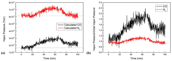 (a) Comparison of calculated CO and N2 trend scans in MAI evaporation. (b) Comparison of the real vapor pressure and initial pressure of CO and N2.