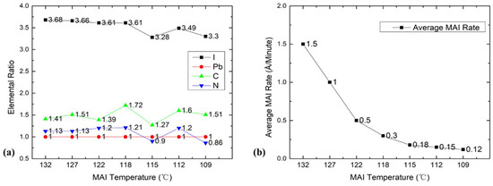 (a) Elemental ratios of the MAPbI3 films evaporated at different MAI evaporation temperatures and 1.75 × 10−8 Torr of water vapor pressure. (b) Average MAI rate from QCM reading as a function of MAI boat temperature.