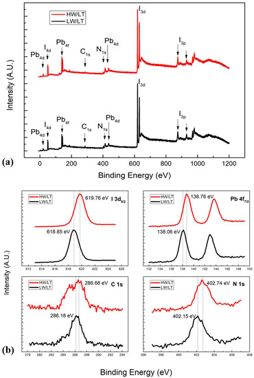 (a) XPS full scan comparison of HW/LT and LW/LT films. (b) I 3d5/2, Pb 4f7/2, C 1s, and N 1s core level spectra comparison of HW/LT and LW/LT films.