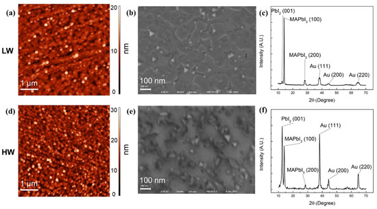 Furthermore, the XRD spectra shown in Figure 7c,f demonstrate the crystallinity of the LW- and HW-evaporated films, respectively. The thin films were grown on an Au-coated Si wafer with a thickness of 800Å because the graphite substrate became uneven after multiple exfoliations, which made it unsuitable for XRD measurement because XRD requires larger film thicknesses. For both films, the perovskite, PbI2, and Au from the substrate can be identified in the spectra. Two perovskite peaks were observed in the LW sample at 14.07° and 28.31°, and these were assigned to the (100) and (200) lattice planes, respectively. The other three peaks at 38.29°, 44.32°, and 64.68° correspond to the (111), (200), and (220) diffractions of the Au substrate, respectively. The PbI2 peak located at 12.65° corresponded to the (001) lattice plane. For LW sample, it is obvious that perovskite peaks were the dominant features of the spectrum but PbI2 had a weak intensity, suggesting that the surface only had a small amount of PbI2. On the contrary, for the HW sample, the intensities of PbI2 and Au peaks greatly increased and even overtook the domination of perovskite peak. Based on our discussion, these can be explained by the idea that some MAI were consumed by water vapor during the evaporation, which led to excess PbI2 on the surface. Due to the crystallization of PbI2, voids may have been generated in the film and further exposed the Au substrate as a PbI2 crystal aggregate, thus leading to the increase of Au peak intensity.