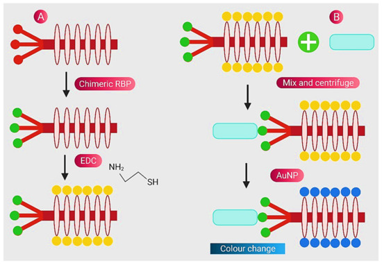 Schematic representation for chimeric phages and detection of pathogens (A) Gray: M13 phage, blue: foreign receptor-binding protein and yellow: thiolated phage by EDC chemistry (B) Blue rectangle: bacteria-infected medium, red: Au NPs and colour change (purple): attachment of Au NPs and thiolated phage. Reprinted from Ref. [77].