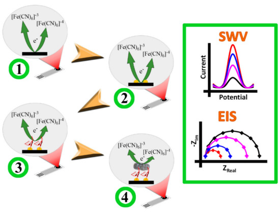 The biosensor’s construction and E. coli detection are depicted in this diagram. In the SWV and EIS curves, the electrochemical behaviour of the unaltered (SPE) electrode in step 1 (left) is schematically illustrated by black lines (right). SPE/ gold NPs (step 2 in left, red lines in SWV and EIS), SPE/ gold NPs /PEP (step 3 in left, blue lines in SWV and EIS), and SPE/ gold NPs /PEP/EC are the electrode’s expected responses (step 4 in left, rose lines in SWV and EIS). Reprinted from Ref. [79].