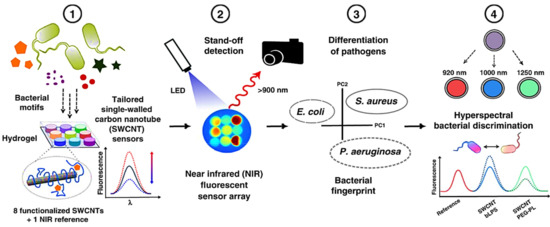 Nibler et al. developed a set of near-infrared (NIR) fluorescence nanosensors based on single-walled carbon nanotubes (SWCNTs) and utilized them for remote fingerprinting of clinically important bacteria [87]. Based on their metabolic fingerprint, this multiplexed sensor array was able to identify the presence of bacteria and differentiate the majority on a species level. Even closely related significant pathogens (S. aureus and Staphylococcus epidermidis) isolated from various human illnesses may be differentiated. This type of multiplexing with NIR fluorescent nanosensors enables remote detection and differentiation of important pathogens and the potential for smart surfaces. A schematic diagram for identifying pathogens by this method is given in Figure 5, showing that a SWCNTs-based nanosensor, in the presence of pathogens, produces a specific fluorescence signal and a PEG based-hydrogel, with 8 fluorescent sensors remotely observed in NIR. Additionally, the growth of pathogens on the hydrogel sensor changes the sensor array fingerprint and can discriminate different infections.