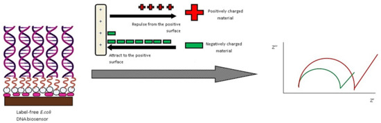 Yuhana et al. developed a new label-free electrochemical DNA biosensor for detecting E. coli bacteria in environmental water samples. The aminated DNA probe was mounted on 3-aminopropyltriethoxysilane-functionalized hollow silica microspheres (HSMs) and placed onto a screen-printed electrode (SPE) carbon paste with integrated gold NPs [92]. The biosensor’s selectivity and specificity were improved. Without a redox mediator, the label-free E. coli DNA sensor had a dynamic linear response range of 1 × 10−10 M to 1 × 10−5 M (R2 = 0.982), with a LOD of 1.95 × 10−15 M. The designed DNA biosensor had a sensibility that was equivalent to non-complementary and single-base mismatched DNA. At 4 °C and pH 7, the DNA biosensor showed a steady response after 21 days of storage. Over three regeneration and rehybridization cycles, the DNA biosensor response was regenerated. The schematic procedure for label-free detection of E. coli by DNA attached-hollow silica NPs was depicted in Figure 6.