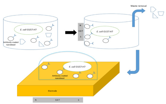 Architecture illustration of antibody-covered nanobeads and low concentration detect of E. coli using a magnetic field procedure. Reprinted from Ref. [93].