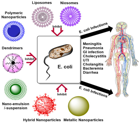 In the 21st century, NPs have emerged as the most innovative system for drug delivery and therapeutic purposes. Different nanomaterials were used to prepare NPs according to their unique characteristics, such as controlled drug release, site-specific targeting, lower side-effects and toxicities, and higher therapeutic efficiency. Meanwhile, bacterial infections are suitably treated with these NPs with promising outcomes. Figure 10 shows different types of NPs which are utilized for the drug delivery and treatment of E. coli infection.