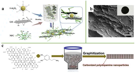 Since Dikin et al. [15] used membrane filters to prepare an ultra-strong graphene oxide paper for the first time in 2007, and vacuum filtration has widely been used in academic research. Many researchers prepared cellulose nanofiber/graphene-based composite film via vacuum filtration in recent years [16,17,18,19,20]. In the electrical shielding application, where electrical insulating materials are required, the excellent electrical conductivity of graphene has become an inevitable obstacle to its application [21]. Therefore, it is important to prepare graphene-based film with insulating properties. Guo et al. [22] fabricated a f-Al2O3@RGO/nanofibrillated cellulose (f-Al2O3@RGO/NFC) composite film via a vacuum filtration process. The preparation process is shown in Figure 1a. The introduction of Al2O3 can not only make the composite film have electrical insulation properties but also increases the thermal transfer path of the composite film. Figure 1b shows the macroscopic photograph and cross-sectional SEM views of the composite film, revealing that the composite film has an ordered and compact structure. The thermal conductivity of cellulose nanofiber/graphene-based composite film is generally low; it is difficult to meet the heat dissipation requirement of modern electronics devices. To achieve high thermal conductivity, carbonization through a high-temperature annealing approach was reported [23]. It was reported that the carbonized polydopamine nanoparticle reinforced graphene films exhibited high thermal conductivity of 1584 W m−1 K−1 through the carbonized process, as shown in Figure 1c [24].