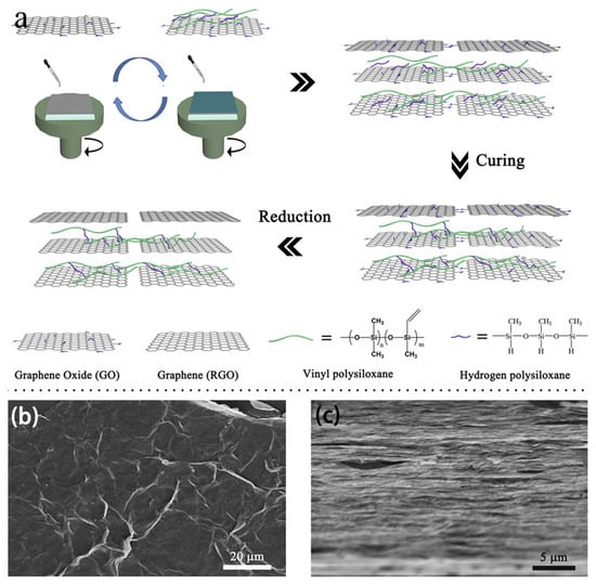 (a) Schematic illustration of the proposed fabrication procedure of SR/RGO multilayered films via spin-assisted LBL assembly. (b) SEM image of GO on SR. (c) Cross-section SEM image of (SR/RGO)40 film. Reprinted with permission from ref. [50] Copyright 2018, Elsevier.