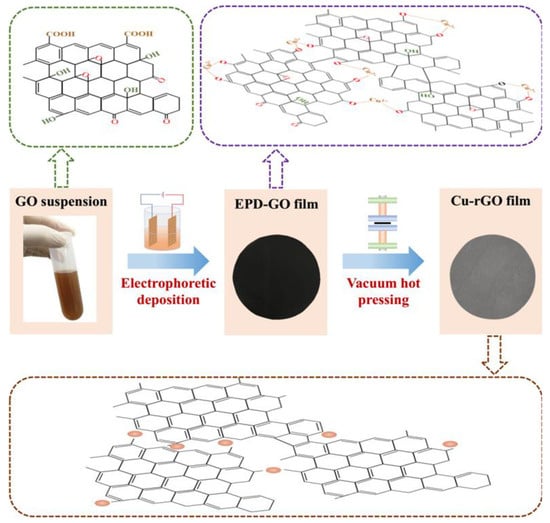 In recent years, electro-deposition has also been used for preparing graphene-based film [51,52,53,54,55,56,57,58]. In the electro-deposition process, the electric field between the two electrodes induces the migration of charged particles and subsequent deposition in a stable suspension [59]. Different foils were fabricated by adjusting electro-deposition parameters such as current density, electro-deposition time, electrolyte concentration, and so on [60].