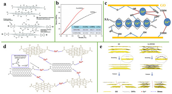 Various oxygen-containing functional groups such as hydroxyl, epoxide, and carboxyl groups are distributed on the surface and edge of GO sheets. Due to the ionization of hydroxyl and carboxyl groups, GO has a strong negative charge when dispersed in water [75]. GO may interact with positively charged metal ions [76]. In nature, the report found that the presence of small amounts of metal elements, (such as Zn, Mn, Ca, or Cu) in insects or other organisms can significantly increase their mechanical strength [77]. Inspired by this phenomenon, Mg2+, Cu2+, Ca2+, Zn2+ and other metal ions were incorporated into the internal structure of GO film to form ionic bonds with oxygen-containing functional groups on GO, which significantly improved the mechanical properties and stability of the graphene-based film. For example, Ruoff et al. [78] modified a graphene oxide paper with a small amount of Mg2+ or Ca2+. Because metal ions were tightly bonded to the carboxyl group on edge of GO sheets, a small amount of Mg2+ or Ca2+ content (less than 1 wt%) can significantly improve the mechanical stiffness (10–200%) and fracture strength (50%) of GO paper, as shown in Figure 8a. Furthermore, Xing et al. [76] introduced the Ca2+ into graphene oxide/Sodium alginate (GO/SA) film via a facile and environmentally friendly method. Because the adjacent graphene oxide sheets were bridged by the SA and Ca2+ through hydrogen bonding and ionic bonding interaction, Ca-GO/SA film with the tensile strength of 97 ± 4 MPa was stronger than GO/SA film with a tensile strength of 80 ± 7 MPa (Figure 8b,c). There are many reports about the use of Ca2+, but some researchers also introduced Cu2+ into the graphene-based film. For example, Wang et al. [79] constructed an ultra-robust and high-toughness GO paper via the synergistic reinforcement of CNTs and Cu2+. Compared with the GO papers, the tensile strength, elastic modulus, and toughness of the Cu-CNTs/GO paper was increased by 409.7%, 81.5%, and 188.2%, respectively. Cu-CNTs/GO composite paper has π-π interactions between CNTs and GO and ionic bonding between Cu2+ and the carboxyl groups on GO sheets or CNTs, as shown in Figure 8d. During the tensile process, the synergistic effect of π-π interactions and ionic bonding interactions enhance the interaction among GO sheets and promote the uniform stress transfer in the composite paper. During the fractures, due to the synergistic inhibition of CNTs and Cu2+, the slippage of GO sheets is restrained compared with the GO paper (Figure 8e).