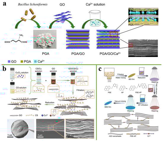 (a) Schematic illustration of the preparation process for GO/PGA/Ca2+ composite films [92]. Reprinted with permission from ref. [92] Copyright 2020, American Chemical Society. (b) The illustration of the fabrication method for rGO-CS-Cu nanocomposites. Reprinted with permission from ref. [93] Copyright 2018, Wiley. (c) Preparation and structural characterization of SBG sheets. Reprinted with permission from ref. [97] Copyright 2018, Wiley.
