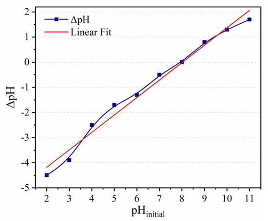 The value of zero-point charge (ZPC) was calculated with the help of salt titration method. The ZPC value of the catalyst was determined using a 10 mol solution of NaClO4. In this method, 0.2 g of catalyst was taken in 10 mL deionized water, and 0.01 mol/L NaOH was added to get the required pH. The suspension was taken in ten different beakers and the pH of the suspensions was initially set to different values from two to 11. This pH value is denoted as pHinitial. The sample of each beaker was stirred briskly for 24 h at room temperature, and the value of pH was recorded. This pH value is denoted as pHfinal. The ZPC is obtained from the plot, between ΔpH (pHfinal–pHinitial) and pHinitial as depicted in Figure 1. For ZPC, ΔpH needs to be zero. The ZPC of ZS1300 is investigated and its value is found as 8 [].