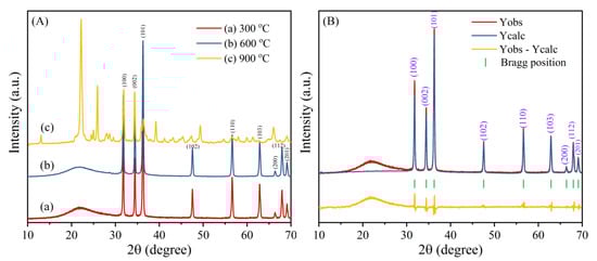 (A) XRD patterns of ZS1 annealed at various temperatures and (B) Rietveld Refined XRD pattern of ZS1300 nanocomposite.