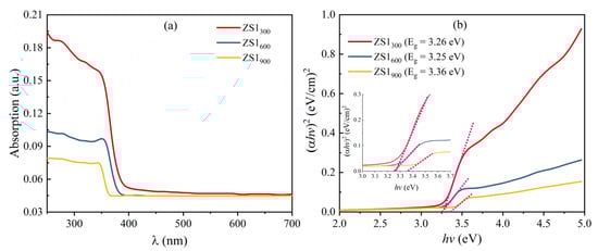 For the examination of the optical band gap of the ZS1300, ZS1600 and ZS1900 samples, UV-Visible spectroscopy is performed, as shown in Figure 5. It is seen that band edge shifted to a lower wavelength edge (i.e., blue shift), suggesting an alteration in the optical band gap. Thereby, to estimate the energy band gap (Eg) of the catalyst samples, Tauc’s relation the spectra (250–700 nm) is used, which is given by