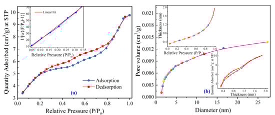 BET isotherm of ZS1300 (a) adsorption and desorption curve and (b) pore size distribution, the thickness of deposited layer (inset) & adsorption quantity versus size of the pore (inset).