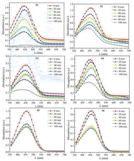 UV–visible spectra of S1, S2, S3, S4, S5, and S6 samples showing degradation of MO.