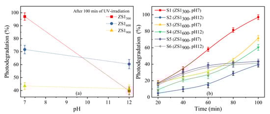 Using Equation (1), the photo-degradation percentages of samples S1, S2, S3, S4, S5, and S6 irradiated under the UV light for 100 min are calculated and the values of photo-degradation (%) are found to be 98.1, 39.7, 71.63, 60.39, 43.51, and 41.34%, respectively (Figure 8a). Interestingly, it is observed that the photocatalytic activity of the S1 sample is relatively higher than the other samples. As the value of pH is increased, the degradation response is decreased and only 39.7 % of MO degradation response is observed for sample S2 (i.e., at pH = 12). The photo-degradation activity depends on the surface properties of the catalyst. Generally, pH changes the surface properties of catalysts like surface charge properties that oversee the absorption mechanism of MO on catalytic surface. At a pH 7 (below ZPC pH i.e., 8), the surface of ZnO is positively charged, which can absorb negatively charged MO due to electrostatic attraction, facilitating the degradation reaction. In contrast, at a higher pH (=12), absorption is decreased due to electrostatic repulsive forces among the catalytic surface and the dyed surface. As a result, photo-degradation response becomes minuscule; this is firstly because of the decrease in adsorption of the dye molecules on surface of the photocatalyst surface at higher pH [,], and secondly due to rapid scavenging of the hydroxyl radicals produced via reaction between holes and OH−, which causes a decrease in free radicals [,]. It is reported that pH affects the production of these free radicals that, in turn, lower the degradation rate of dye, or the termination of degradation [].