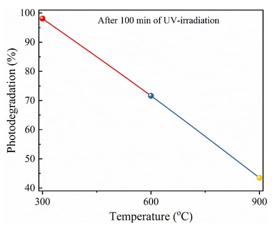 The photocatalytic efficiency of the ZS1 nanocomposite at different annealing temperatures has also been assessed for the photo-degradation of MO. Figure 9 shows the correlation between photo-degradation (%) of MO with annealing temperatures of ZS1 nanocomposite. It is observed that the photocatalytic degradation of MO decreases from 98.1% to about 39% with an increase in the annealing temperature of the sample ZS1 (i.e., sample ZS1300 to ZS1900. The highest activity observed for the ZS1300 nanocomposite may be ascribed to the higher specific surface area, lower band gap value, and efficient charge separation ability of the sample through the charge exchange process in the existence of UV light. The lowest photo-degradation ability of the sample ZS1900 can be due to the decrease in specific surface area due to the filling of the pore by the penetration of ZnO into the SiO2 porous matrix, as observed from the XRD and BET studies. The lower reactivity of SiO2 towards photo-degradation and the presence of higher content of SiO2 on the upper surface as expected from XRD pattern could be another reason for the lower efficiency of ZS1900 sample.