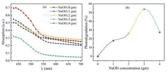 To investigate the effect of NaOH concentration on the photo-degradation ability of the nanocomposite samples, four different concentrations (1, 2, 3 and 4 g) of NaOH are mixed with the photocatalyst and MO solution. In a typical process, 0.38 g of catalyst powder was dispersed in 100 mL deionized water and then 10 mL of methyl orange dye solution was added to catalyst solution and stirred to adsorb the dye molecules on surface of the photocatalyst. After that, 1 g of NaOH powder was mixed with the above solution containing methyl orange and photocatalyst, then the solution was stirred in absence of light to achieve equilibrium between adsorption and desorption and then irradiated with visible irradiation light with continuous stirring []. After the decoloration of methyl orange, a part of the solution was used for recording the absorbance spectrum using a UV-Visible spectrophotometer and photo-degradation percentage was calculated using Equation (1). The same steps are followed for the degradation of MO with different weights (2, 3 and 4 g) of NaOH and the recorded absorption spectra are shown in Figure 10a.