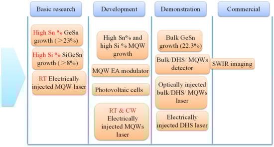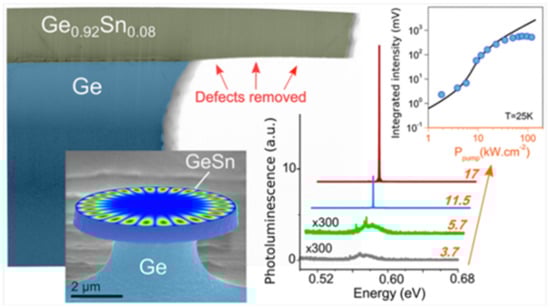 - Saito, S.; Al-Attili, A.Z.; Oda, K.; Ishikawa, Y. Towards monolithic integration of germanium light sources on silicon chips. Semicond. Sci. Technol. 2016, 31, 043002. [Google Scholar] [CrossRef]