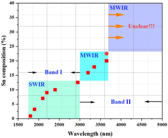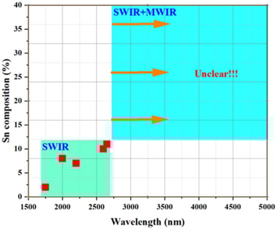 | 2012 | 9% | 13 or 20 nm | GeSn/Ge 3QWs | 2200 nm | 0.1 A/W at 5 V | [58] |
