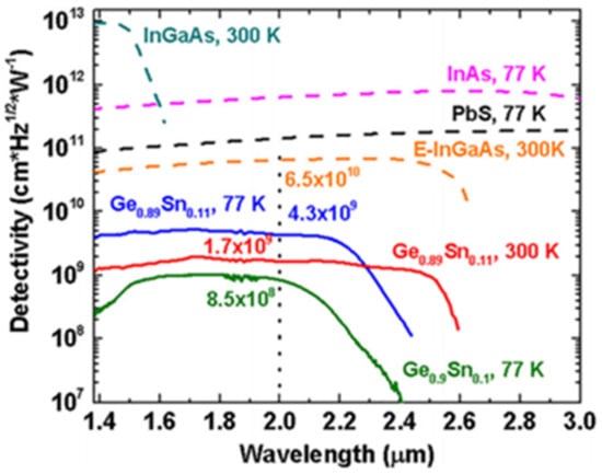 | 2018 | 11% | 700 nm | p–Ge/p–GeSn/i–GeSn/n–GeSn/n–Ge | 2650 nm | 0.32 A/W | [65] |