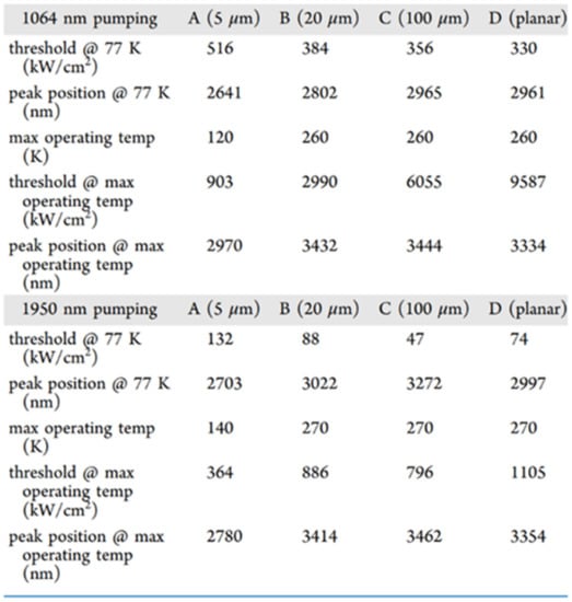 | MQW-B | 13.5 | 12 (10×) | Pulsed 1064 nm | No lasing | ||||