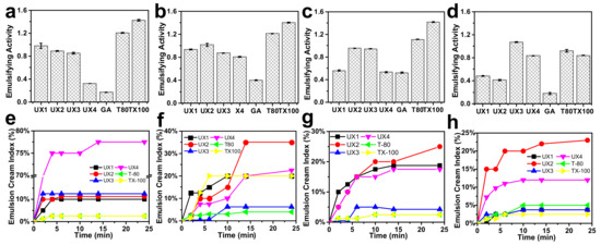 Emulsifying activity (a–d) and emulsion cream index after centrifugation (e–h) at 0.5, 1, 2, and 4 wt% emulsifier concentrations.