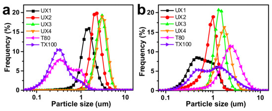 The xylan colloidal dispersions (UX1–UX4) were used as an emulsifying agent to produce oil-–water emulsions and were compared with gum arabic (GA), Tween 80 (T80), and Triton X-100 (TX100). GA is a type of polysaccharide collected from Acacia senegal and is one of the most common natural food emulsifiers. T80 and TX100 are typical synthetic non-ionic surfactants. The obtained emulsions were tested for emulsifying activity (EA) and emulsion cream index (ECI), where EA refers to the ability of the emulsifier to form an emulsion and ECI corresponds to the stability of the formed emulsion [29]. For EA (Figure 4a–d), xylans had much better EA than GA at all emulsifier concentration levels. Xylan dispersions showed lower EA values than synthetic emulsifiers at low emulsifier concentrations, but UX3 showed the highest EA (1.07) and UX4 showed a comparable EA (0.84) to synthetic emulsifiers (0.92 for T80 and 0.84 for TX100) at a high emulsifier concentration of 4 wt%. For ECI (Figure 4e–h), in general, xylan dispersions showed emulsifying stabilities comparable to the synthetic emulsifiers, except at a very low emulsifier concentration of 0.5 wt%. UX3 in particular showed an excellent ECI that was maintained below 5% after centrifugation for 24 min. UX1 also showed an ECI maintained below 5% after 24 min, but only at a high emulsifier concentration of 4 wt%. The emulsifying stability of xylan dispersions can also be proved by the pictures of emulsions after standing for seven days (Figures S3 and S4). The particle size of the emulsion is also an important indicator for the evaluation of the formed emulsions [29]. Xylan-assisted emulsions showed larger and comparable particle sizes at emulsifier concentrations of 0.5% and 2%, respectively, compared to those of T80 and TX100, but they also showed narrower particle distributions than those of T80 and TX100 (Figure 5).