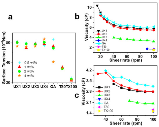 In general, xylan colloidal dispersions had much better emulsifying properties than those of GA and had comparable emulsifying properties to synthetic emulsifiers (Figure 4). T-80 and TX100 have a high surface activity as shown by their low surface tension (Figure 6a) and, therefore, can be quickly adsorbed onto the oil–water interface to assist the stabilization of an emulsion [30]. The emulsifying properties of xylan dispersions are quite dependent on their concentrations, which may be due to the fact that the viscosity of xylan dispersions is concentration dependent and shear thinning (Figure 6b,c). Previous research has shown that the rheological property of emulsifiers plays an important role in stabilizing emulsions, besides interfacial adsorption [31,32]. This suggests that UX1 has a good ECI, which is comparable to that of T80 and TX100 only at a high emulsifier concentration. This also explains the better emulsifying properties of UX3 than UX4, since UX3 has a higher viscosity than that of UX4 (Figure 4b–d and Figure 6b,c).