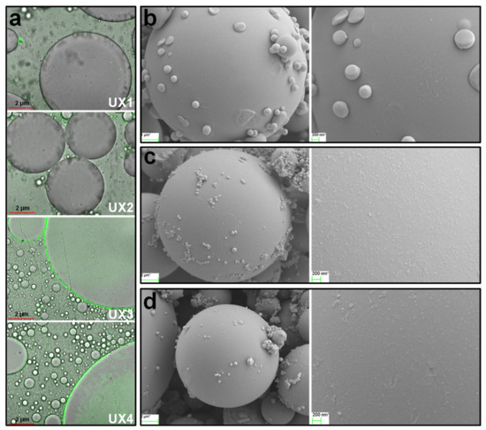 (a) Laser confocal microscope images of UX1–UX4 adsorption on the oil droplet surface. FESEM images of the rigid polystyrene droplet (produced from in situ polymerization) surface: (b) no emulsifier, (c) UX3, and (d) UX4 as the emulsifier.