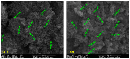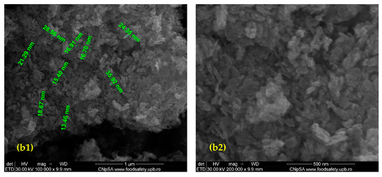 The micrographs obtained for this experimental variant display a uniform coating deposited on the whole surface of the Si substrate. At a magnification of 100,000× (Figure 14a), NPs dimensions are between 25 and 30 nm, with irregular morphologies. Besides, the SEM image taken at 50,000× magnification (Figure 14b) shows the embedding of ZnO aggregates into the polymer matrix.