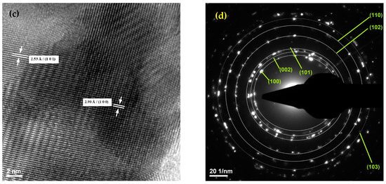TEM and SAED analyses were used to determine the size, aspect, growth direction, and nature of the formed crystalline ZnO phases. TEM micrographs (a) and (b) in Figure 3 show the irregular polyhedron shapes of ZnO nanoparticles with uniform size distribution and a slight agglomeration tendency. The high-resolution transmission electron microscopy (HR-TEM) image in Figure 3c reveals the ordered growth direction of the crystalline planes of the ZnO wurtzite lattice, while the SAED pattern of the concentric diffraction rings visible in Figure 3d are in excellent agreement with the results of the XRD analysis confirming the presence of the same diffraction planes and the polycrystalline nature of the samples [47].
