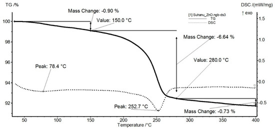 The thermal analysis for the ZnO sample (Figure 4) indicates the presence of three independent mass loss processes. The first mass loss between RT-150 °C represents 0.90% and is due to eliminating residual solvent molecules. The second process, with a mass loss of 6.64%, represents the main decomposition step. It is accompanied by an endothermic effect with a minimum of 252.7 °C. The process can be attributed to the decomposition of some zinc nitrate impurities. The mass loss continues slowly after 280 °C, without noticeable effects on the DSC curve, up to 400 °C 0.73% mass loss being recorded.